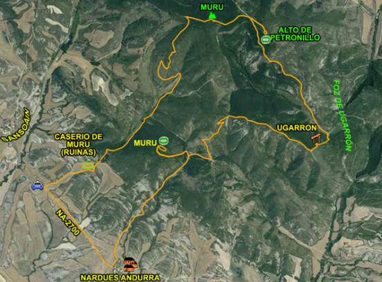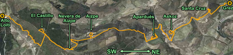De Apardués nos dirigimos al cercano desolado de Askoz desde el que la pista nos conduce bajo la ladera oriental de El Gorrillonar hasta su extremo N desde donde ascendemos a la cumbre de Santa Cruz y descendemos al poblado de Grez, sobre el que se descuelga por el N la cumbre de Iruzkun, la cumbre meridional de la Sierra de Gongolatz.