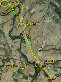 La vía verde continua por los poblados de Artieda y de Rípodas donde un fornido puente de 5 ojos salva el río Areta y, siguiendo de cerca el trazado de la carretera NA-150, se dirige hacia Lumbier.