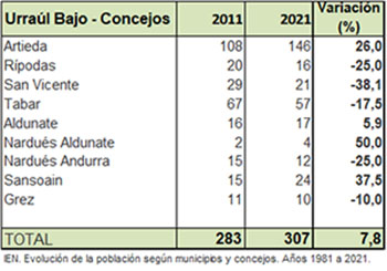Sin embargo, en las primeras décadas de este siglo Urraúl Bajo frenó este descenso poblacional, no sólo se detuvo, sino que obtuvo una muy ligera recuperación. Pero, analizando los datos por los concejos que componen el municipio, nos percatamos de que algunos de ellos pierden población, pero otros incrementan su población
