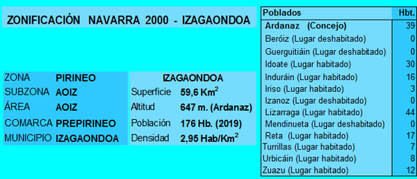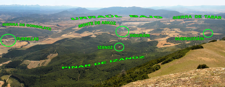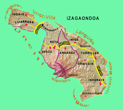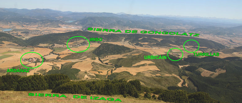 Paisaje Natural de Izagaondoa. Tomando referencias, observamos que el Valle y municipio de Izagaondoa se encuentra al N-NE de la Peña de Izaga. Vemos que es un valle que se forma en dos espacios. Uno, que ocupa la mayor parte, está dirigido al SE y se forma entre las laderas septentrionales de la Sierra de Izaga, de NW a E, y las laderas meridionales del monte Leguin (782 m.) y de la Sierra de Gongolatz (832 m.) al N y las laderas occidentales del monte Askoz (Santa Cruz 682 m.) y de la Sierra de Tabar(791 m.) al E. En este espacio se encuentran los poblados de Zuazu, Reta, Ardanaz, Iriso, Urbicáin, Turrillas e Induráin.