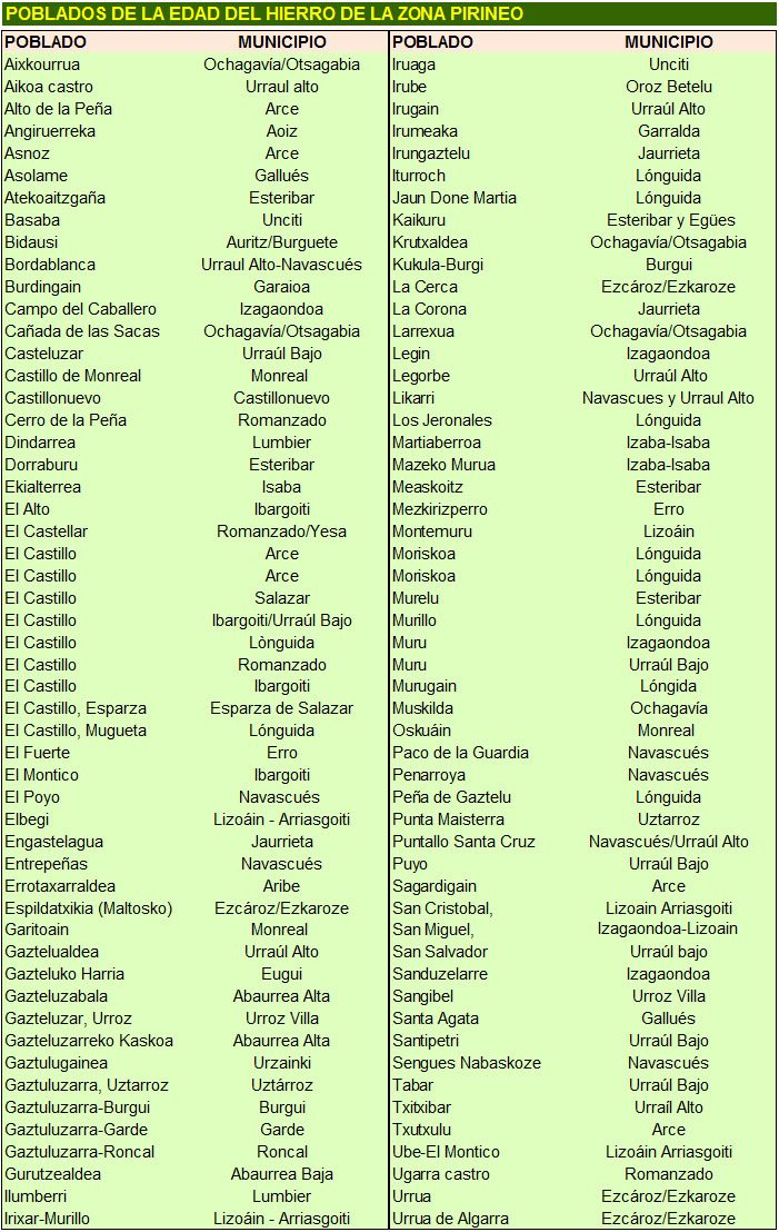 Por su parte, Juan Mari Martínez Txoperena está dedicándose últimamente a la prospección de este tipo de asentamientos. En la página web "Megalitos Pirenaicos. Poblados de la Edad del Hierro" tiene expuestos, (a 30 de Diciembre de 2021), 140 poblados de la Edad del Hierro, cantidad ésta que puede incrementarse en la medida en continúen estas prosfecciones,