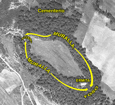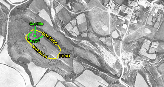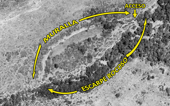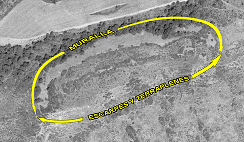 El Castillo. Ortofoto 1966-71. Su mayor exponente lo compone la potente muralla defensiva, de unos 300 m. de longitud, derruida y desparramada por la ladera N y por sus extremos E y W del promontorio. Todavía permanece en pié algún pequeño trozo del muro que la formaba.