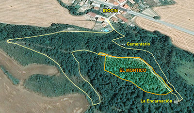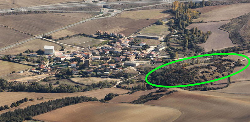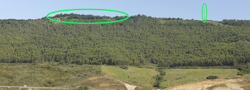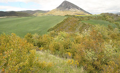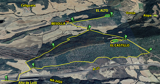El Castillo - El Alto de Besolla Accedemos a este PEH desde el Alto de Loiti por una pista que se inicia hacia el N, hacia la Sierra de Tabar. Pocos metros después de cruzar el puente sobre la autovía, llegamos a un cruce donde tomamos la dirección E por la que llegamos a un cortafuego, abierto para el tendido eléctrico que cruza la sierra de S a N.