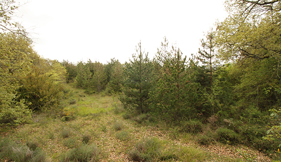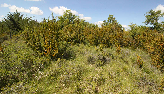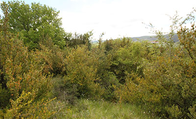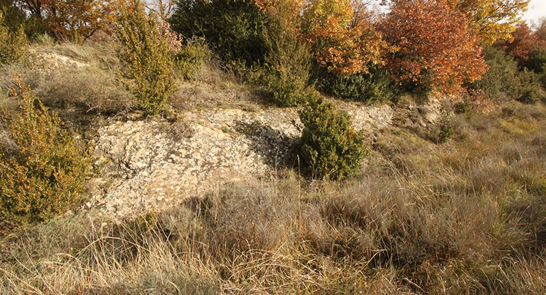 Besolla. El Alto. Ortofoto 1966-71 Este es un espacio allanado sobre la muralla al N y en ligera pendiente hacia el S hasta culminar sobre el farallón rocoso. Todo él, con algunas excepciones sobre la muralla, está repleto de una tupida capa vegetal compuesta por bojes, coscojas, zarzas y espinos que obstaculizan los movimientos por su interior e impiden la visión del suelo y con ello la prospección del mismo. No obstante, al igual que en el Castillo se encontraron varios fragmentos de cerámica celtibérica y manufacturada y otros de molinos de mano.