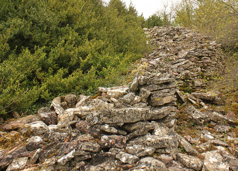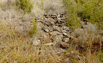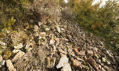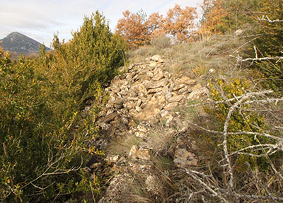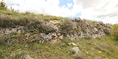 En el descenso por la ladera S observamos algunos elementos que bien pudieron corresponder a la estructura defensiva de este PEH. Se trata de algunas acumulaciones de piedras que podrían ser restos de una muralla defensiva para proteger el acceso al poblado por este lado.