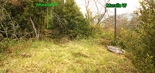 Por la línea S, defensivamente más débil, se observan pliegues verticales de roca que habrían sido aprovechados para la defensa de este lado, reforzados con una muralla, de la que quedan vestigios derruidos de la misma.