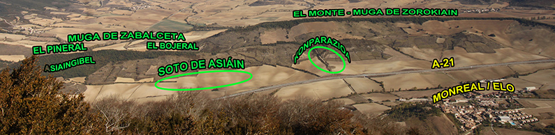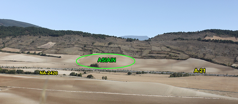 Asiáin (Aciáin). El paraje del Soto de Asiáin es quien nos da la pista de la posible situación de este desolado, ubicado entre la ladera meridional del Bojeral, muga con Zabalceta (Unciti), y la A-21. La ladera recibe el nombre de Cabecera del Soto de Asiáin.