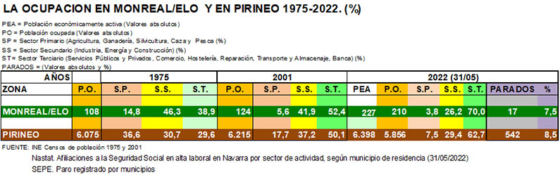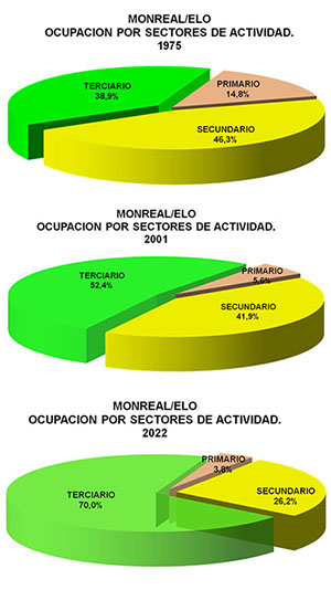 Evidentemente ya con los datos de población y de la agricultura y ganadería de los últimos años es muy previsible que la ocupación en Monreal sea diferente, no ya de los valles vecinos, sino también del conjunto de la Zona Pirineo. Observando los datos de ocupación por sectores de actividad durante el último cuarto del siglo pasado y primeras décadas del presente, tenemos: