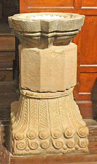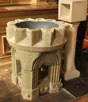 En la iglesia se conservan dos pilas bautismales muy interesantes. La primera es la pila bautismal de la iglesia. Es estrellada de doce puntas y la base es un prisma de cuatro caras grabadas en cada una de ellas una portada de iglesia, con arco apuntado y tres arquivoltas con sus correspondientes columnas lisas.