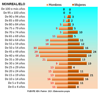 La población extranjera alcanza un indicador de 3,5 personas por cada 100 habitantes, por debajo de la Zona Pirineo y que, por todas las circunstancias expuestas, Monreal/Elo no es polo de atracción poblacional dentro del conjunto de la Zona Pirineo. Vemos finalmente la pirámide de población de Monreal que resume todas estas características señaladas.