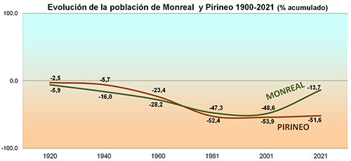 La construcción de la Autovía del Pirineo (A-21) ha sido un factor decisivo en este sentido. Hoy día es sencillo y rápido vivir en Monreal y trasladarse diariamente a Pamplona para asuntos laborales o de servicios, situación esta que afecta a distintos poblados de las cercanías de Pamplona. En el año 2022 la población continuaba creciendo, alcanzando los 486 habitantes. Indica que las circunstancias anteriores van apuntalando este crecimiento, pequeño pero constante.